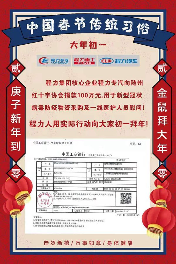 湖北程力公司捐款100萬(wàn)為新型肺炎防控