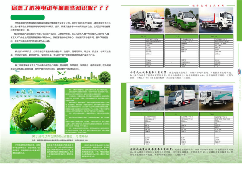 程力新能源純電動專用汽車隸屬于程力集團,簡稱“程力新能源”,集團是一家擁有“國家高新技術企業(yè)”“中國民企500強”“中國馳名商標”的大型汽車制造集團,是集汽車技術研發(fā)、汽車制造、客車制造、汽車改裝、汽車零部件、金融、教育、置業(yè)投資為一體的多元化集團公司。 關于程力新能源汽車 程力新能源汽車制造股份有限公司是程力集團旗下全資子公司,成立于2016年2月19日,注冊資金伍千萬元整,是一家專業(yè)從事新能源純電動專用汽車研發(fā)、生產(chǎn)、銷售及服務于一體的高新技術企業(yè)。公司位于湖北省隨州市曾都區(qū)星光一路。 程力新能源汽車制造股份有限公司,占地500余畝,員工700余人,其中專業(yè)技術人員50多人,技術工人300余名,公司現(xiàn)有新能源技術研發(fā)中心、新能源零部件檢測中心、新能源汽車總裝車間、整車下線檢測線。年生產(chǎn)純電動專用汽車能力1萬余臺(輛)。 關于程力純電動車型 截止到2021年5月,公司目前已開發(fā)出純電動灑水車、洗掃車、壓縮垃圾車、吸塵車、抑塵車、勾臂式垃圾車、密閉式垃圾車、路面養(yǎng)護車、餐廚垃圾車、等60多個自主創(chuàng)新新能源純電動汽車系列產(chǎn)品。 主要純電動底盤合作商以及生產(chǎn)能力 程力新能源裝備車專業(yè)廠的純電動底盤合作商有比亞迪商用、東風商用、東風股份、福田新能源;程力新能源依托成熟強大的供應鏈,月生產(chǎn)能力可達100臺,緊急情況下可達到200臺。 關于純電動汽車三電系統(tǒng) 電池:負責給車輛底盤電機、上裝電機提供動力源,相當于燃油車油箱;新能源純電動主要由電芯與電池管理系統(tǒng)等組成,電動車車載電池一般使用鋰離子電池,國內(nèi)的電動汽車所用鋰離子電池一般采用三元鋰電和磷酸鐵鋰兩種。 讓天更藍讓水更綠 三元鋰電特點:能量密度最高,同等質(zhì)量下電池電容量更高,續(xù)航里程更長,熱穩(wěn)定性差、低溫性能好,但是安全性相比磷酸鐵鋰更差。特斯拉等歐美車主要選擇此類電池。 磷酸鐵鋰特點:能量密度中等,同等質(zhì)量下電容量和續(xù)航里程低于三元鋰電,低溫性能差、熱穩(wěn)定性好;安全性相當可靠,在所有鋰電池里面安全性最高,且其發(fā)展前景相當廣闊。(比亞迪下一代刀片電池就具有更高的能量密度。同等質(zhì)量電容量與續(xù)航里程與三元鋰電不相上下)、比亞迪、寧德時代等國內(nèi)頂尖電池企業(yè)均采用磷酸鐵鋰電池;我公司生產(chǎn)車型電池90%為磷酸鐵鋰。 電機:負責給車輛底盤驅(qū)動、上裝驅(qū)動提供動力,大概相當于燃油車發(fā)動機;電機是電動車電驅(qū)系統(tǒng)的主要部分,電驅(qū)主要由傳動系統(tǒng)、電機、逆變器組成,純電動車用電機主要有直流電機、感應電機、永磁同步電機三種。國內(nèi)主流生產(chǎn)企業(yè)基本上都用永磁同步電機,永磁同步電機具有最低的電能損耗、最高的峰值效率、比功率、可靠性強、尺寸小等優(yōu)點。 電控:電池輸出的電流經(jīng)過電控系統(tǒng),調(diào)控到底盤電機或上裝電機適用的電壓,對電動汽車的爬坡、加速、減速、倒車等主要性能進行調(diào)控。主要作用大概相當于燃油車變速箱:但功能更加復雜。關于純電動車型質(zhì)保以及售后、電池壽命東風、福田等底盤目前在全國的商用車4S服務站售后服務,總部提供技術支持。 BYD底盤單獨的售后體系、目前比亞迪純電動底盤三電系統(tǒng)質(zhì)保電池性能在充放電4000次以內(nèi)衰每個省會都有駐點,由駐點服務人員5年25萬公里,東風和福田的純電動減在15%以內(nèi),壽命超過8年;電池更售后服務,后期根據(jù)當?shù)卣加辛縼黹_底盤三電系統(tǒng)質(zhì)保5年20萬公里;底換價格根據(jù)更換時的4S店實際價格,底盤其他配件質(zhì)保與燃油車相同。車輛具體政策還未統(tǒng)一下來。電池回收目通售后服務網(wǎng)點。上裝系統(tǒng)和配件質(zhì)保2年(易損件除前大概是200元/kw左右;具體價格以外)。實時實地價格為準。 目前程力新能源汽車制造股份有限公司已取得新能源純電動專用車作業(yè)類、廂式類整車生產(chǎn)許可資質(zhì),公司已開發(fā)純電動灑水車,抑塵車廂式運輸車、純電動冷藏車、純電動勾臂式垃圾車、純電動密閉式垃圾車等10多個自主創(chuàng)新新能源純電動汽車系列產(chǎn)品。 |