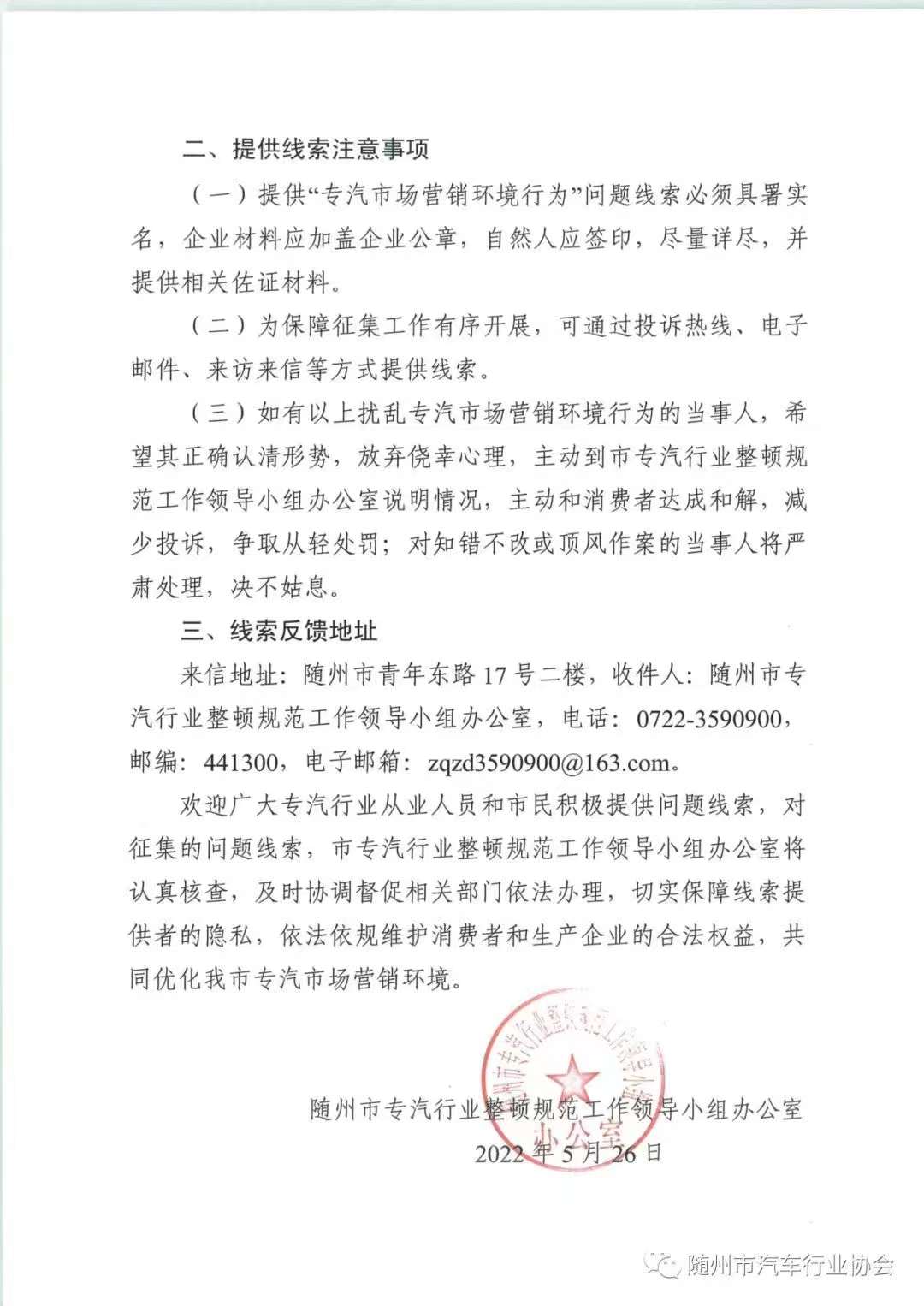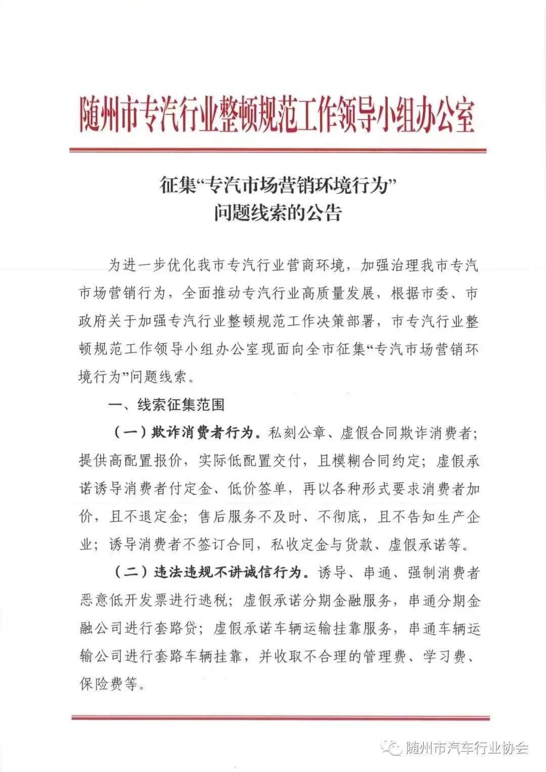 隨州市汽車行業(yè)協(xié)會關(guān)于整頓“隨州專汽市場營銷環(huán)境行為”銷售欺詐投訴舉報公告