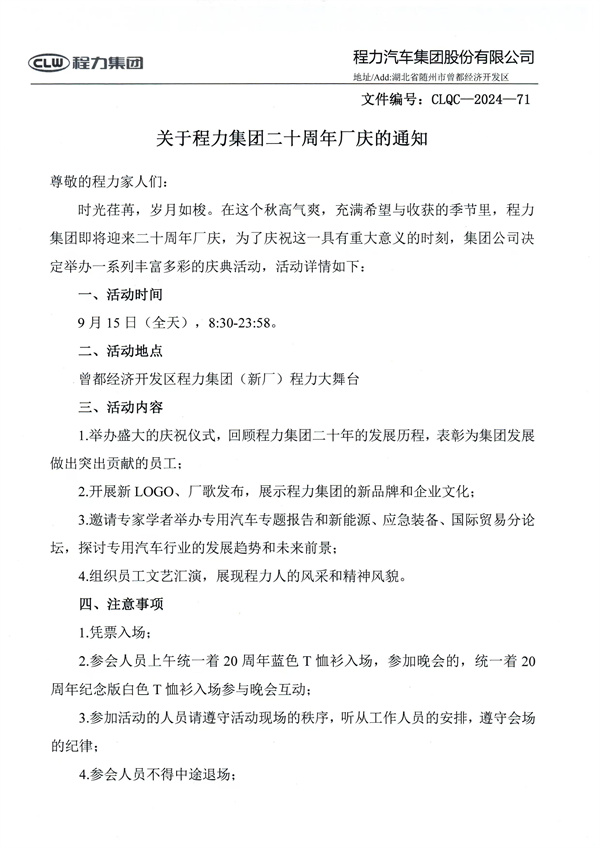 關(guān)于程力集團(tuán)二十周年廠慶的通知 尊敬的程力家人們: 時(shí)光荏苒,歲月如梭。在這個(gè)秋高氣爽,充滿希望與收獲的季節(jié)里,程力集團(tuán)即將迎來(lái)二十周年廠慶,為了慶祝這一具有重大意義的時(shí)刻,集團(tuán)公司決定舉辦一系列豐富多彩的慶典活動(dòng),活動(dòng)詳情如下: 一、活動(dòng)時(shí)間 9月15日(全天),8:30-23:58。 二、活動(dòng)地點(diǎn) 曾都經(jīng)濟(jì)開(kāi)發(fā)區(qū)程力集團(tuán)(新廠)程力大舞臺(tái) ![]() 三、活動(dòng)內(nèi)容 1.舉辦盛大的慶祝儀式,回顧程力集團(tuán)二十年的發(fā)展歷程,表彰為集團(tuán)發(fā)展做出突出貢獻(xiàn)的員工; 2.開(kāi)展新LOGO、廠歌發(fā)布,展示程力集團(tuán)的新品牌和企業(yè)文化; 3.邀請(qǐng)專(zhuān)家學(xué)者舉辦專(zhuān)用汽車(chē)專(zhuān)題報(bào)告和新能源、應(yīng)急裝備、國(guó)際貿(mào)易分論壇,探討專(zhuān)用汽車(chē)行業(yè)的發(fā)展趨勢(shì)和未來(lái)前景; 4.組織員工文藝匯演,展現(xiàn)程力人的風(fēng)采和精神風(fēng)貌。 四、注意事項(xiàng) 1.憑票入場(chǎng); 2.參會(huì)人員上午統(tǒng)一著20周年藍(lán)色T恤衫入場(chǎng),參加晚會(huì)的,統(tǒng)一著20 周年紀(jì)念版白色T恤衫入場(chǎng)參與晚會(huì)互動(dòng); 3.參加活動(dòng)的人員請(qǐng)遵守活動(dòng)現(xiàn)場(chǎng)的秩序,聽(tīng)從工作人員的安排,遵守會(huì)場(chǎng)的紀(jì)律; 4.參會(huì)人員不得中途退場(chǎng); 5.請(qǐng)大家在活動(dòng)期間注意安全,確保人身和財(cái)產(chǎn)安全; 6.請(qǐng)各子公司、各部門(mén)提前做好活動(dòng)準(zhǔn)備工作,確;顒(dòng)順利進(jìn)行; 二十年風(fēng)雨兼程,二十載春華秋實(shí),程力集團(tuán)的二十年,是拼搏奮進(jìn)的二十年,是開(kāi)拓創(chuàng)新的二十年,以二十周年廠慶為新的起點(diǎn),鄭重邀請(qǐng)各位程力家人們出席公司“20周年慶”活動(dòng),共同分享程力集團(tuán)的美好時(shí)刻,為實(shí)現(xiàn)程力集團(tuán)愿景目標(biāo)而努力奮斗! 特此通知。 ![]() ![]() |