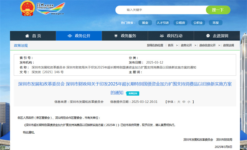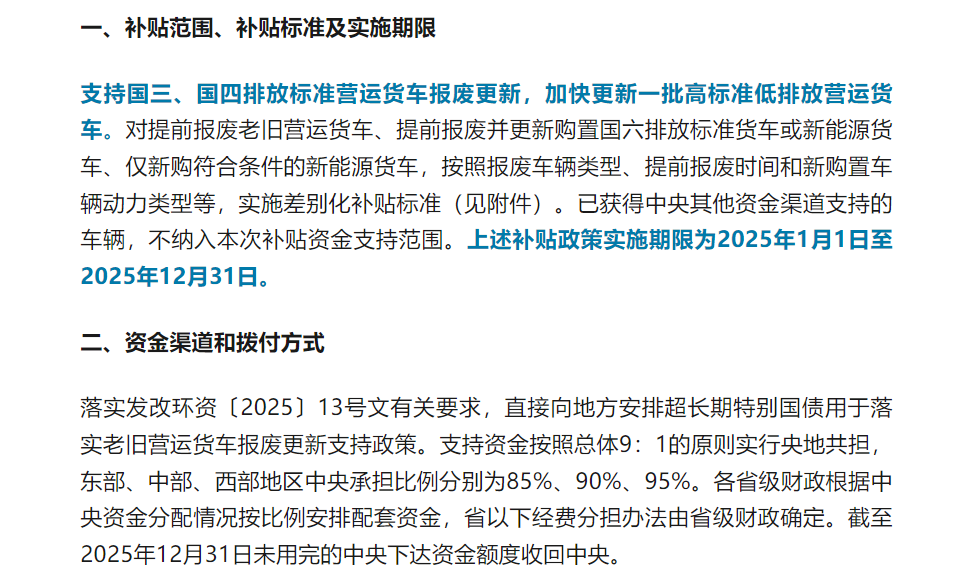 3月14日 深圳啟動以舊換新實施方案 深圳市發(fā)展和改革委員會、深圳市財政局關于印發(fā)2025年超長期特別國債資金加力擴圍支持消費品以舊換新實施方案的通知 ,明確指出,在2024年政策基礎上,將老舊營運貨車報廢更新補貼范圍擴大至國四排放標準營運貨車。對提前報廢國四及以下排放標準營運柴油貨車,平均每輛補貼3萬元;提前報廢并新購國六排放標準貨車或新能源貨車,平均每輛補貼8萬元;僅新購新能源城市冷鏈配送貨車,每輛補貼3.5萬元。