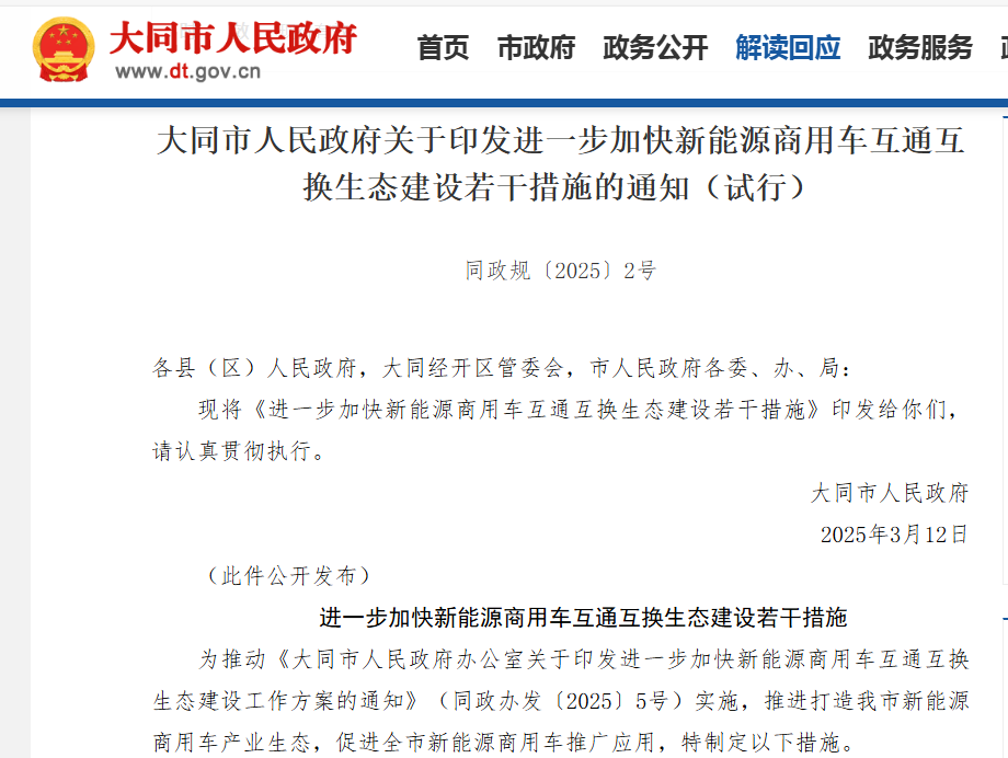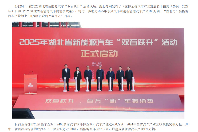 3月19日 (下午)三部門聯(lián)合升級貨車更新政策:交通運輸部、發(fā)改委、財政部將老舊貨車補貼范圍擴展至國三/國四排放車輛,取消燃料類型限制。根據(jù)新規(guī),提前報廢并更換新能源貨車的企業(yè)最高可獲14萬元/車補貼,購置國六車型補貼7萬元。政策特別設置"綠色通道",對參與氫燃料電池車示范運營的企業(yè)額外給予3萬元運營補貼。支持資金按照總體9:1的原則實行央地共擔。 3月20日 湖北省確定汽車產(chǎn)業(yè)“雙百萬”目標 湖北省分別發(fā)布了《支持全省汽車產(chǎn)業(yè)發(fā)展若干措施(2024—2027年)》和《2025湖北省新能源汽車促消費政策》,將進一步助力2025年“湖北造”新能源汽車產(chǎn)量邁上100萬輛臺階的目標。 3月21日 大同構建新能源商用車生態(tài)圈 3月29日 央企重組開啟產(chǎn)業(yè)新格局 3月,財政部的扶持政策不僅延長了購置稅減免期限,還加大了對充換電基礎設施和智能網(wǎng)聯(lián)技術的投入,為新能源專用車的市場推廣和基礎設施建設提供了有力保障。此外,三部門聯(lián)合升級的貨車更新政策,提供了豐厚的補貼,將促進新能源專用車的銷售。湖北省確定汽車產(chǎn)業(yè)“雙百萬”目標不僅為當?shù)?/span>提供了政策支持和市場需求保障,還促進了產(chǎn)業(yè)鏈的協(xié)同發(fā)展和新能源專用車的普及推廣。這一系列政策將有助于推動新能源專用車產(chǎn)業(yè)的快速發(fā)展和壯大。 |