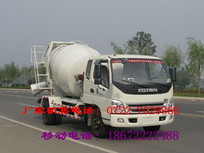 時代金剛排半駕駛室,玉柴130馬力196kw, 增壓發(fā)動機,9-10噸后橋,斷氣剎,6檔箱,帶副變速153橋,825-16或900-20鋼絲胎,280雙層大梁,方向助力,暖風,帶攪拌車取力器。 3方福田混凝土攪拌運輸車參數(shù):