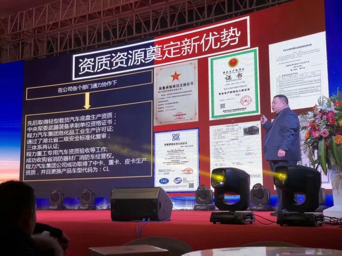 三、資質(zhì)資源奠定新優(yōu)勢(shì): 在公司各個(gè)部門通力協(xié)作下,先后取得輕型載貨汽車底盤生產(chǎn)資質(zhì);中央軍委武器裝備承制單位資格證書;程力汽車就團(tuán);饭I(yè)生產(chǎn)許可證;通過了湖北省二級(jí)安全標(biāo)準(zhǔn)復(fù)審;三體系在認(rèn)證;程力重工專用汽車資質(zhì)驗(yàn)收等工作;成功收購省消防器材廠消防車經(jīng)營(yíng)權(quán);程力汽車集團(tuán)公司成功取得了重卡、重卡資質(zhì),并且跟換產(chǎn)品車型代碼:CL
