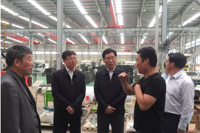 (圖一:各位領(lǐng)導(dǎo)來到宣傳車車間視察,左邊至右邊依次為萬副區(qū)長(zhǎng)、曾區(qū)長(zhǎng)、梁副主席、程力重工常務(wù)副總李會(huì)成、祁家灣街道張主任)