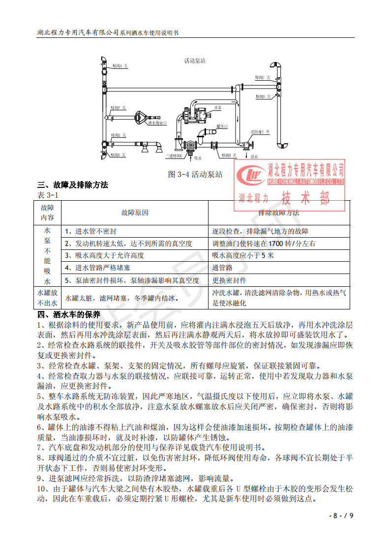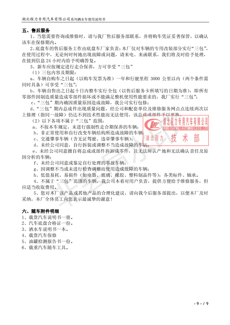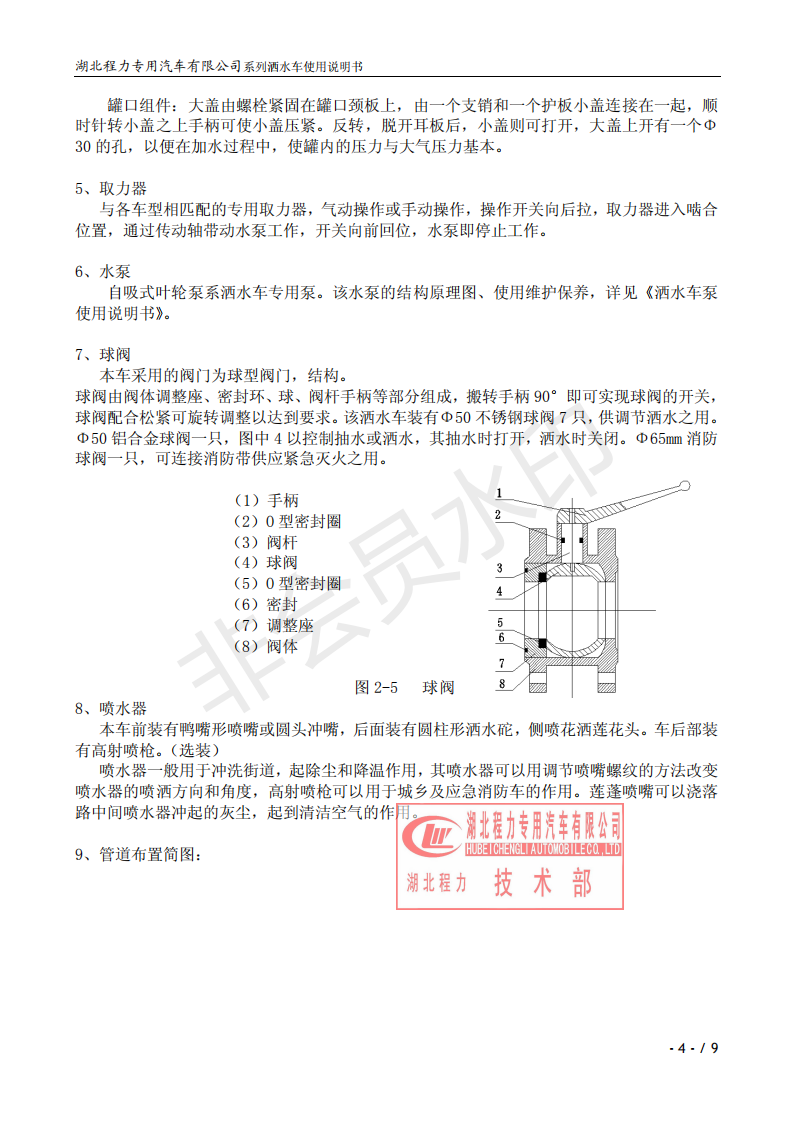 湖北程力專業(yè)生產東風小霸王灑水車、東風多利卡灑水車、東風灑水車、東風大金剛灑水車、東風140灑水車、東風140/47灑水車、東風145灑水車、東風153灑水車、東風1254灑水車、東風前四后八灑水車、東風天龍灑水車、半掛灑水車、解放系列灑水車、汽油灑水車等各類灑水車。用戶可自帶底盤我廠提供上裝部件的生產改裝。 灑水車前沖(噴)后灑,帶側噴,罐體后帶工作平臺,平臺上安裝綠化灑水炮,灑水炮可全方位旋轉,可連續(xù)調成直沖狀、大雨、小雨、毛毛雨,帶安全護欄,配備全國質量評比第一名的杭州威龍大功率專用灑水泵,泵可自吸自排,安裝過濾網,帶消防接口,可通過消防栓進水,帶自流閥,隨車選裝20米綠化卷盤,可噴灑農藥,罐體金屬漆。 灑水泵情況說明:大功率專用灑水泵,采用國際領先意大利技術,在國內生產各系列專用泵已有50年歷史,產品質量成熟可靠,設計先進合理,使用方便快捷,比同類灑水泵壓力大、吸程遠、使用壽命長,克服其它灑水泵易被雜物纏住、壓力小、吸水慢的缺點,引領國內外灑水泵行業(yè)標準,市場占有率93%。關于湖北程力灑水車使用說明書介紹如下,用戶不清楚可以直接打印出來。 ![]() ![]() ![]() ![]() ![]() ![]() ![]() ![]() ![]() |
