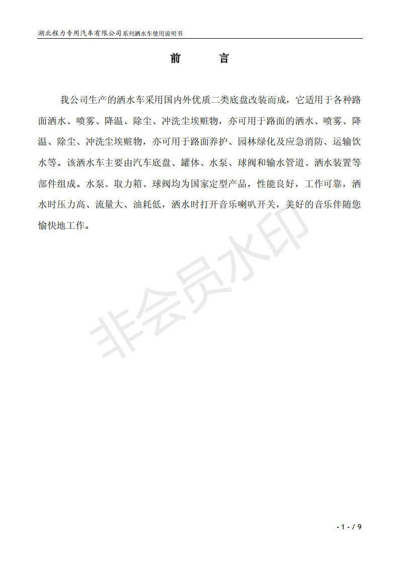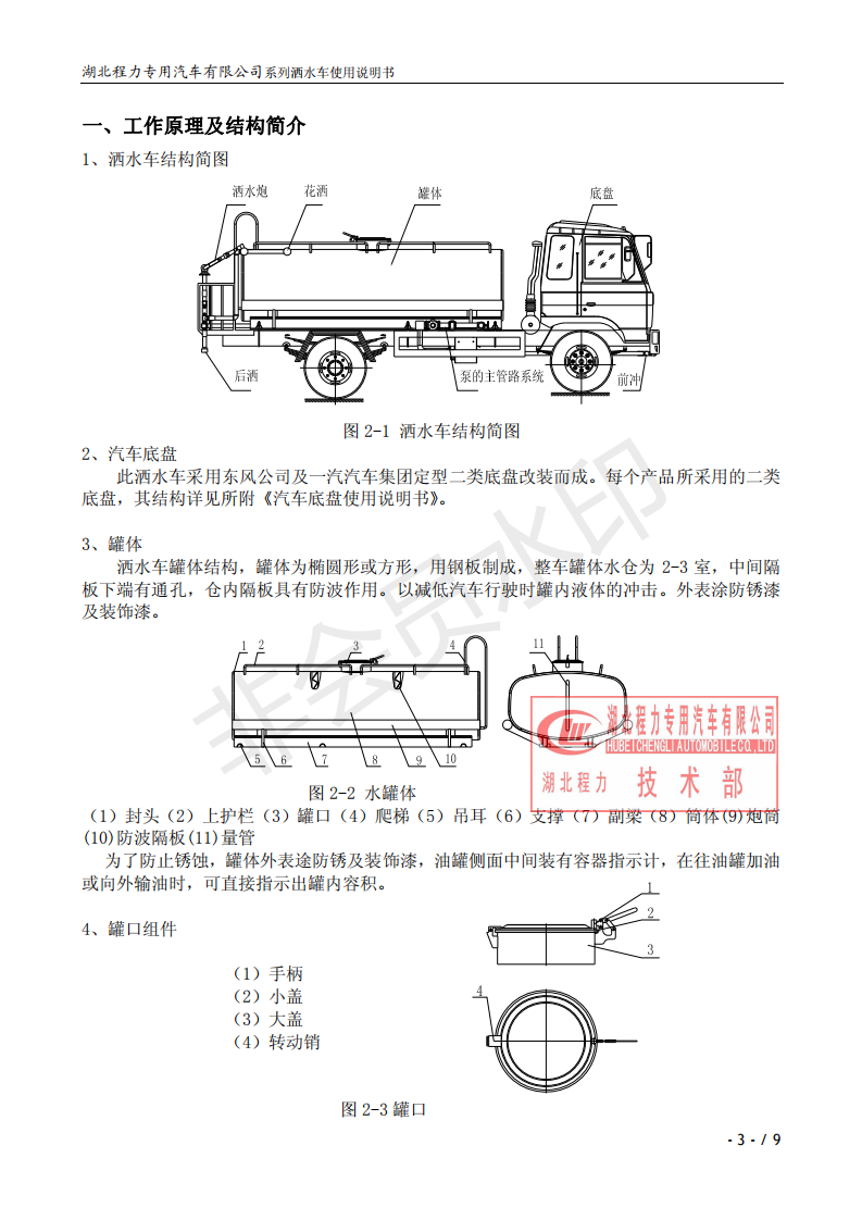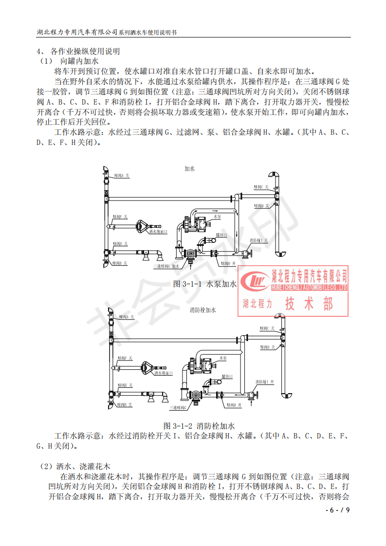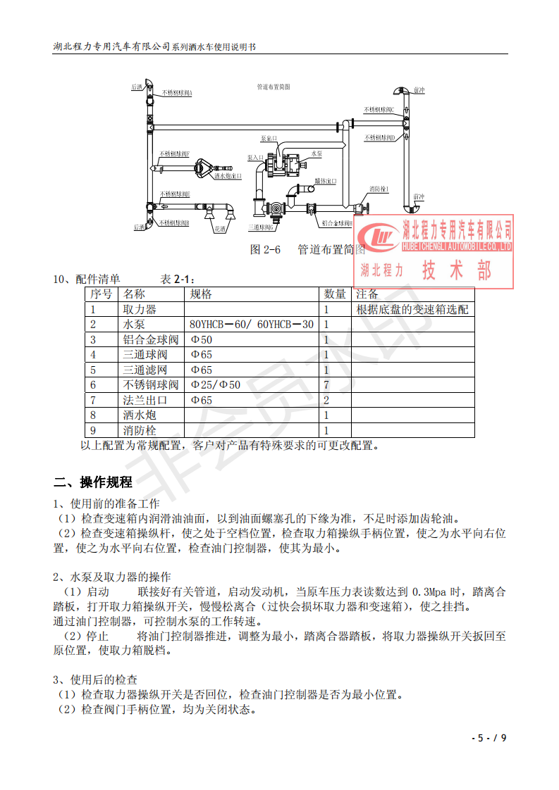湖北程力專業(yè)生產東風小霸王灑水車、東風多利卡灑水車、東風灑水車、東風大金剛灑水車、東風140灑水車、東風140/47灑水車、東風145灑水車、東風153灑水車、東風1254灑水車、東風前四后八灑水車、東風天龍灑水車、半掛灑水車、解放系列灑水車、汽油灑水車等各類灑水車。用戶可自帶底盤我廠提供上裝部件的生產改裝。 灑水車前沖(噴)后灑,帶側噴,罐體后帶工作平臺,平臺上安裝綠化灑水炮,灑水炮可全方位旋轉,可連續(xù)調成直沖狀、大雨、小雨、毛毛雨,帶安全護欄,配備全國質量評比第一名的杭州威龍大功率專用灑水泵,泵可自吸自排,安裝過濾網,帶消防接口,可通過消防栓進水,帶自流閥,隨車選裝20米綠化卷盤,可噴灑農藥,罐體金屬漆。 灑水泵情況說明:大功率專用灑水泵,采用國際領先意大利技術,在國內生產各系列專用泵已有50年歷史,產品質量成熟可靠,設計先進合理,使用方便快捷,比同類灑水泵壓力大、吸程遠、使用壽命長,克服其它灑水泵易被雜物纏住、壓力小、吸水慢的缺點,引領國內外灑水泵行業(yè)標準,市場占有率93%。關于湖北程力灑水車使用說明書介紹如下,用戶不清楚可以直接打印出來。 ![]() ![]() ![]() ![]() ![]() ![]() ![]() ![]() ![]() |