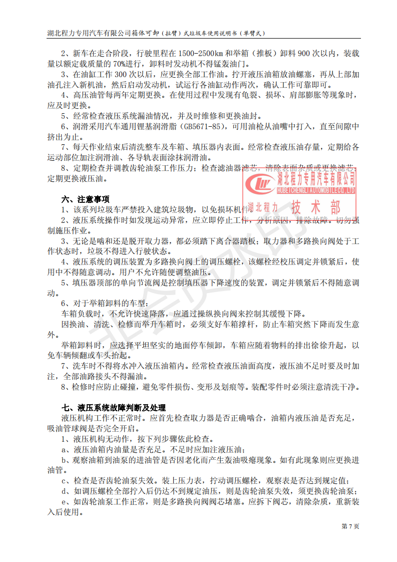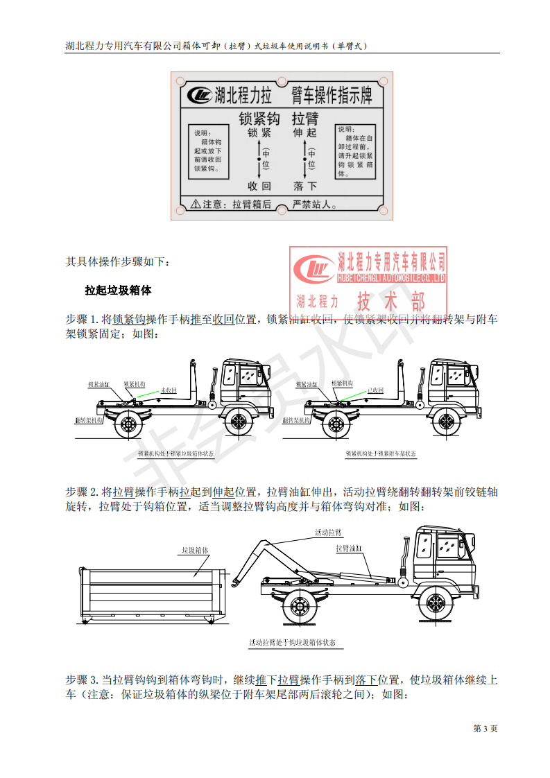 湖北程力車廂可卸式勾臂垃圾車使用說明書