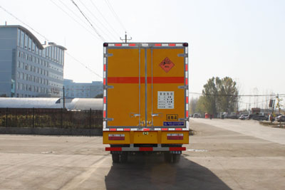 運(yùn)輸品名:炸藥,雷管,煙花爆竹等,類項(xiàng)號(hào):1.1B,1.1D,1.1G,1.2G,1.3G,1.4G 等。廂體頂部封閉不可開啟,側(cè)、后防護(hù)裝置材料材質(zhì)為Q235A碳鋼,側(cè)防護(hù)與箱體底部焊接連接,后防護(hù)裝置與車架采用焊接連接,后防護(hù)截面尺寸(mm):100×50,離地高度為450mm。該車隨底盤選裝駕駛室,選裝側(cè)面開門。僅選用發(fā)動(dòng)機(jī)型號(hào): ISB3.9-125E40A、YC4E140-42對(duì)應(yīng)的油耗值分別為(L/100km): 18.83、19.39。安裝前輪盤式制動(dòng)器,安裝子午線輪胎和帶ABS的底盤。安裝帶有衛(wèi)星定位功能的行駛記錄儀。ABS系統(tǒng)生產(chǎn)廠家/型號(hào):東風(fēng)電子科技股份有限公司汽車制動(dòng)系統(tǒng)公司/36BG13-30010。 |