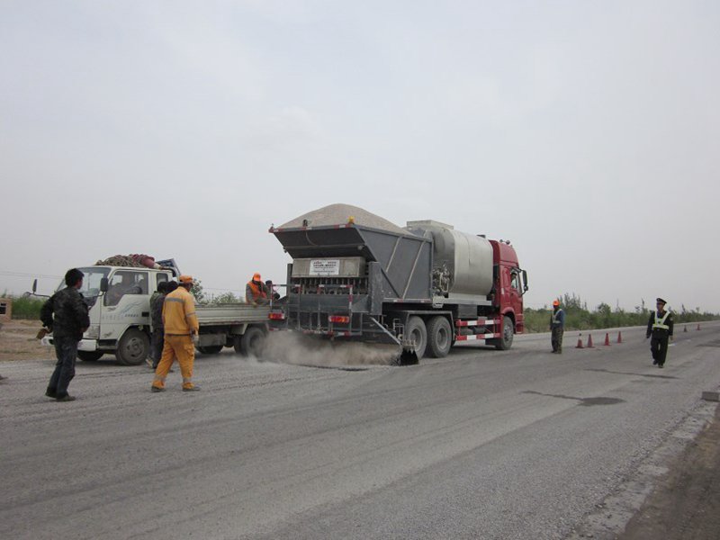 二、同步碎石封層車(chē)系統(tǒng)配置 同步碎石車(chē)主要有瀝青灑布系統(tǒng)、石料撒布系統(tǒng)、電氣操作系統(tǒng)、輔機(jī)系統(tǒng)組成。 瀝青灑布系統(tǒng) 噴灑系統(tǒng)主要有瀝青罐體、加熱部分、液壓部分、控制部分和噴灑部分組成。 1、瀝青罐 罐體外壁采用不銹鋼磨砂板,中間加保溫填料,內(nèi)部由加熱鍋爐和導(dǎo)熱油盤(pán)管組成,外觀整潔大方。罐體外部增設(shè)的氣控閥組,實(shí)現(xiàn)了瀝青在管路中的大小循環(huán),避免了瀝青局部過(guò)熱、老化。 2、加熱部分 加熱裝置選用進(jìn)口燃燒器和配套的高效鍋爐,它具有燃燒效率高,霧化效果好,耗油量少,加熱速度快,運(yùn)行安全、穩(wěn)定等。不需要人工的監(jiān)護(hù),保證管路中的瀝青都能獲得有效的加熱溫度。 3、液壓部分 采用國(guó)際知名品牌的元件(液壓泵、液壓馬達(dá)),保證傳動(dòng)性能的可靠。 4、控制部分 采用編碼器分別準(zhǔn)確檢測(cè)車(chē)速、瀝青泵轉(zhuǎn)速,確保灑布精度,其中雷達(dá)、編碼器以及主電路開(kāi)關(guān)元件均是進(jìn)口元件。設(shè)定灑布量后,PLC自動(dòng)計(jì)算出車(chē)速和泵速,實(shí)現(xiàn)了灑布的自動(dòng)控制,并可以為司機(jī)推薦合理車(chē)速。 5、噴灑部分 每個(gè)噴嘴的啟閉都有氣閥單獨(dú)控制來(lái)實(shí)現(xiàn),通過(guò)特殊的管道設(shè)計(jì),保證壓力均勻及良好的噴灑效果。 石料撒布系統(tǒng) 石料撒布系統(tǒng)有料倉(cāng)、料門(mén)控制機(jī)構(gòu)和撒布器組成。 料倉(cāng)內(nèi)安裝有內(nèi)影藏式中置頂翻轉(zhuǎn)軸采用通軸保證料倉(cāng)升起的平穩(wěn)性;料門(mén)為16路控制,采用了角度螺旋角度控制儀,要使料門(mén)達(dá)到某個(gè)開(kāi)度,可在角度控制儀上設(shè)置料門(mén)打開(kāi)角度,非常方便,準(zhǔn)確。有效調(diào)整撒布均勻度,改變了傳統(tǒng)石料撒布不均的情況;分料板和下料板的調(diào)節(jié)范圍大,適用不同規(guī)格(S3~S24mm)的石料。 電氣操作系統(tǒng) 1、根據(jù)不同的工作需求給操作人員提供準(zhǔn)確的灑布參數(shù)。 通過(guò)后操作臺(tái)上顯示屏參數(shù)的設(shè)定,實(shí)際測(cè)量參數(shù)不斷的改變能準(zhǔn)確的反應(yīng)出設(shè)備的運(yùn)行情況。 2、手動(dòng)操作簡(jiǎn)單,能實(shí)現(xiàn)手動(dòng)/自動(dòng)的切換,提高了工作效率。 3、能根據(jù)路面的寬度隨意調(diào)整噴灑瀝青、撒布石料的寬度。 4、采用限位開(kāi)關(guān)裝置,對(duì)噴頭架、料倉(cāng)升降的進(jìn)行控制,避免超程使人機(jī)受到傷害。 5、配置導(dǎo)熱油自動(dòng)報(bào)警裝置,具有料位上限、下限報(bào)警,瀝青下限報(bào)警指示功能。 三、 設(shè)備優(yōu)點(diǎn) ◆ 獨(dú)家采用全液壓驅(qū)動(dòng)模式,不需要添加任何輔助動(dòng)力使操作更加簡(jiǎn)單方便。 ◆ 獨(dú)家采用高效的導(dǎo)熱油鍋爐升溫,使溫升速度大大的得到提升,打破了傳統(tǒng)的煙道加溫方式。 ◆ 該設(shè)備采用內(nèi)舉升料斗就可實(shí)現(xiàn)石屑撒布施工,更方便涵洞施工、橋下施工、以及彎道施工; ◆ 該設(shè)備完全采用電氣控制,自動(dòng)化程度高,,能精確的計(jì)算出設(shè)備在施工過(guò)程中瀝青噴灑量和石屑撒布量的多少; ◆ 料門(mén)控制采用角度儀,保證設(shè)備下料的精度; ◆ 降低了施工的勞動(dòng)強(qiáng)度,節(jié)約了人力資源,降低施工成本,提高工作效率、工作質(zhì)量; ◆ 整機(jī)運(yùn)行穩(wěn)定,撒布均勻,可自由調(diào)節(jié)灑瀝青撒料寬度; ◆ 良好的保溫層確保保溫性能指數(shù)≤20℃/8h,且防腐耐用; ◆ 可以噴灑各種瀝青介質(zhì),撒布從S3~S24mm的石料; ◆ 設(shè)備采用加工精確度高的噴嘴,使每個(gè)噴嘴噴灑一致性和噴灑效果得到充分保證; ◆ 整體操作更具人性化,具有遠(yuǎn)程控制,也有現(xiàn)場(chǎng)操作,給操作者帶來(lái)了很大的便利; ◆ 通過(guò)電氣控制與液壓系統(tǒng)恒壓裝置的完美結(jié)合,實(shí)現(xiàn)了零起步噴灑; ◆ 整機(jī)經(jīng)過(guò)多次的工程施工改進(jìn),工作性能可靠,操作維護(hù)方便,性?xún)r(jià)比高。 四、注意事項(xiàng) 1、 灑布車(chē)在一次作業(yè)完畢或轉(zhuǎn)換施工場(chǎng)地時(shí),必須對(duì)瀝青泵和管路進(jìn)行清洗,否則下次無(wú)法工作。 2、 灑布車(chē)在噴灑前,一定要檢查各閥門(mén)位置是否正確。 3、 加入瀝青罐內(nèi)的熱態(tài)瀝青必須達(dá)到160~180℃的工作溫度,長(zhǎng)距離運(yùn)輸或工作時(shí)間過(guò)長(zhǎng),可使用加溫裝置保溫,但不能當(dāng)作熔油爐。 4、 瀝青罐不能灌的太滿(mǎn),加油口蓋必須關(guān)緊,運(yùn)輸過(guò)程中以防瀝青溢出。 5、 用燃燒器對(duì)罐內(nèi)瀝青加溫時(shí),瀝青高度必須超過(guò)燃燒室上平面,否則燃燒室將被燒壞。 6、 假如瀝青泵和管道被凝固的瀝青堵塞,不可以強(qiáng)行轉(zhuǎn)動(dòng)泵,可使用噴燈烘烤,應(yīng)避免直接烘烤球閥和橡膠件。 7、 剛開(kāi)始噴灑瀝青時(shí),起步須緩慢,汽車(chē)保持低速行駛。不得猛踩油門(mén),以防離合器、瀝青泵等部件損壞。 8、 本車(chē)有前后兩個(gè)控制臺(tái),當(dāng)使用前控制臺(tái)時(shí),需將開(kāi)關(guān)撥到前控制,此時(shí)后控
